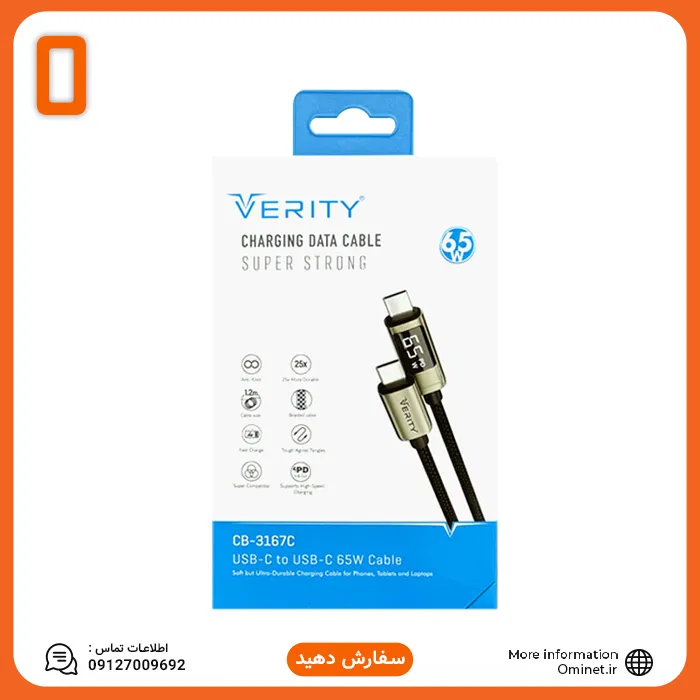 کابل دیتا و شارژ دو سر تایپ C وریتی مدل CB3167C، با ترکیب سرعت شارژ بالا، دوام استثنایی و طراحی حرفه‌ای، یکی از بهترین انتخاب‌ها برای کاربران حرفه‌ای و روزمره است. نمایشگر LED این شارژر تایپ سی، امکان مشاهده توان لحظه‌ای شارژ را فراهم کرده و کنترل بیشتری روی فرایند شارژ به کاربران می‌دهد.
